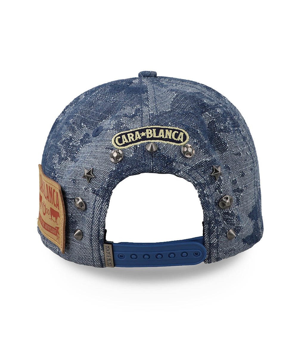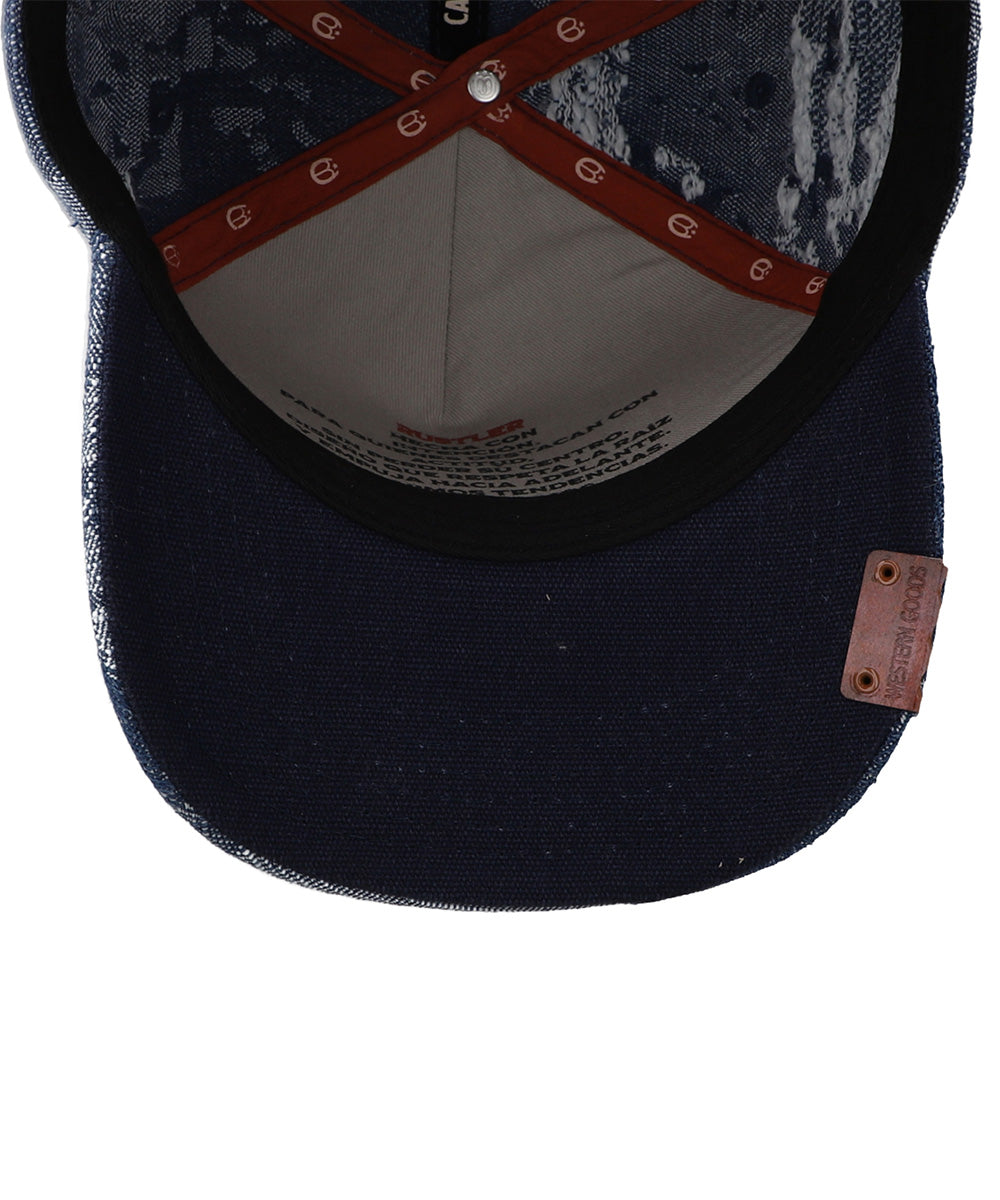 La gorra Cara Blanca Camo Jacquard en color azul destaca por su diseño con textura tipo denim y patrón camuflaje jacquard que le da un look moderno y diferente. El parche frontal con el logo CB y los detalles metálicos refuerzan su carácter western contemporáneo. Una gorra ideal para quienes buscan estilo auténtico, actitud y personalidad en cada outfit.