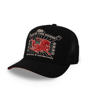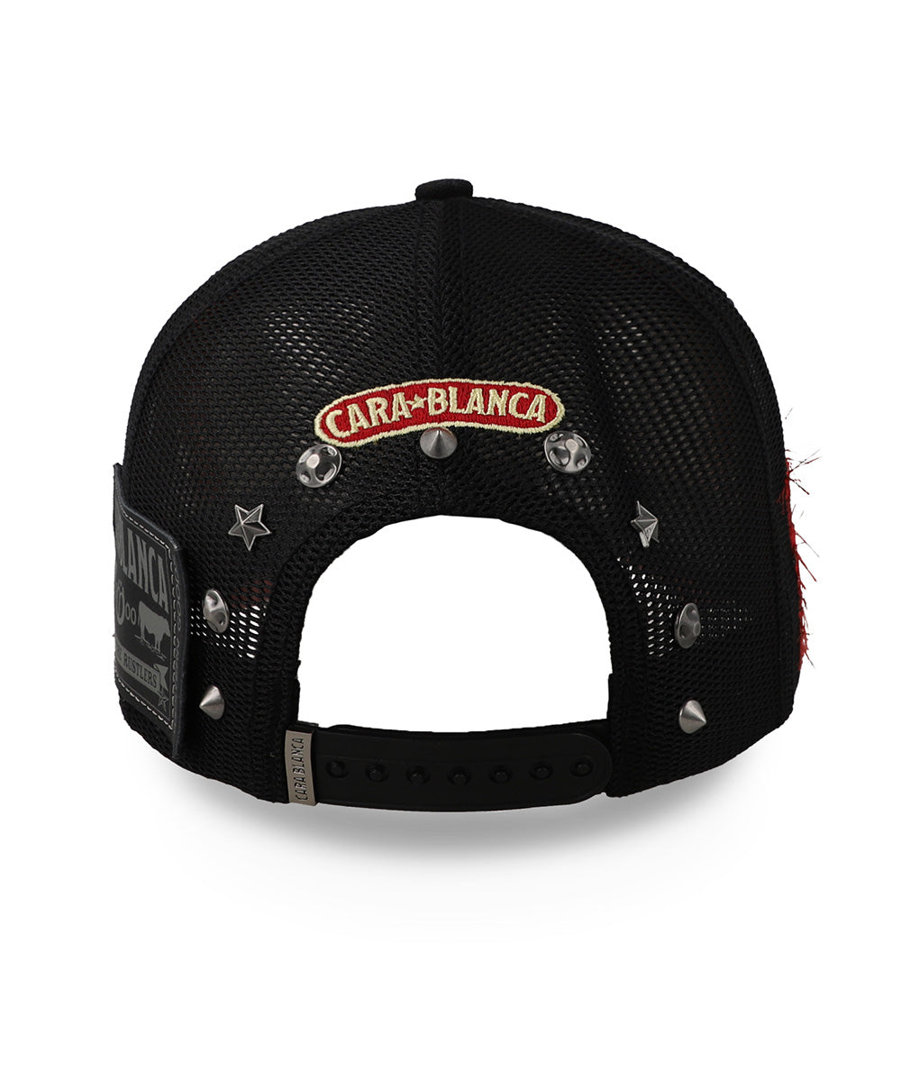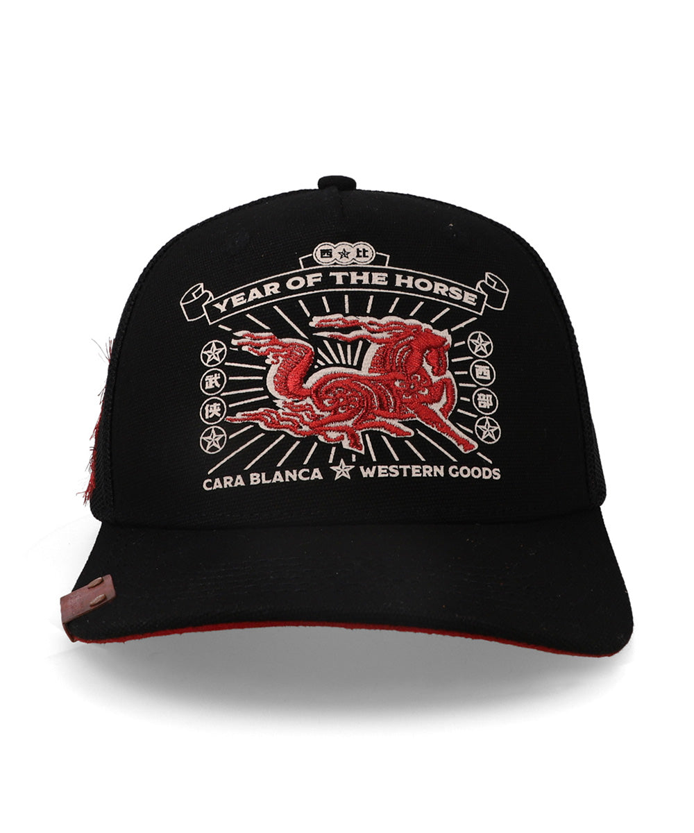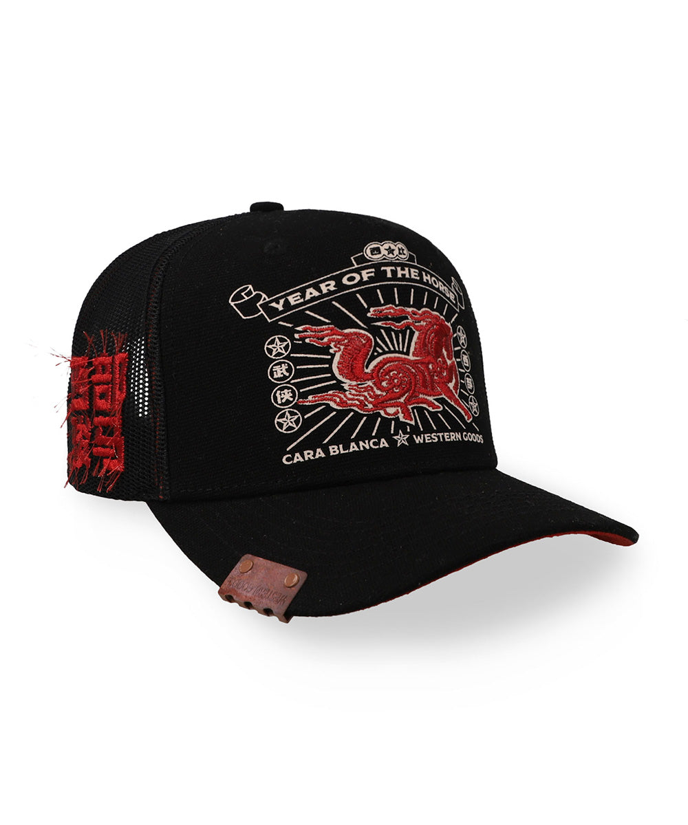 La gorra Cara Blanca Golden Stallion en color negro destaca por su diseño con caballo bordado en rojo y gráfico Year of the Horse al frente, inspirado en la fuerza y el espíritu del oeste. Su panel trasero de malla brinda ventilación y comodidad para el uso diario. Una gorra con carácter, ideal para quienes buscan un estilo western auténtico y lleno de personalidad.