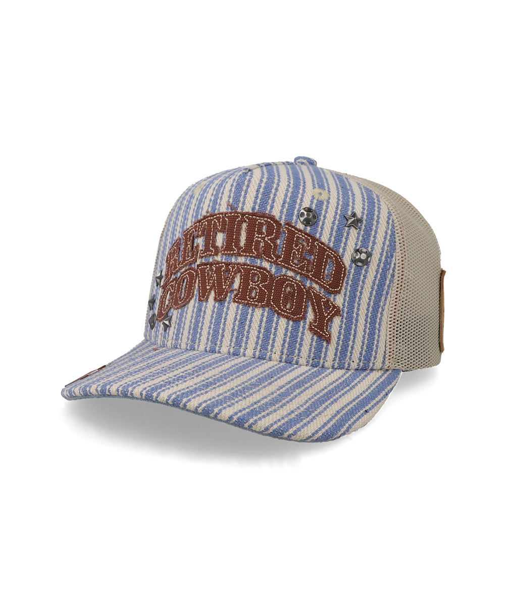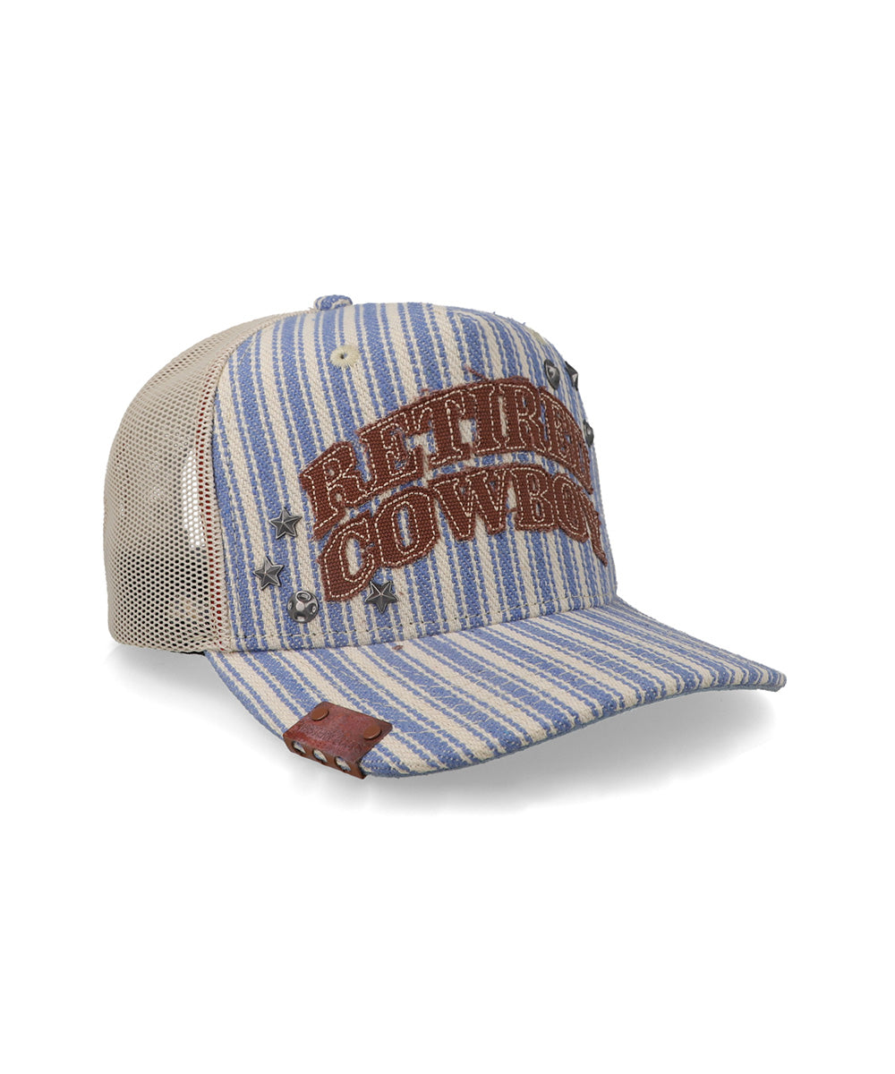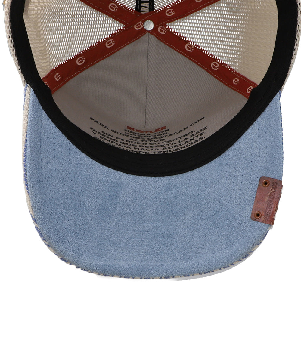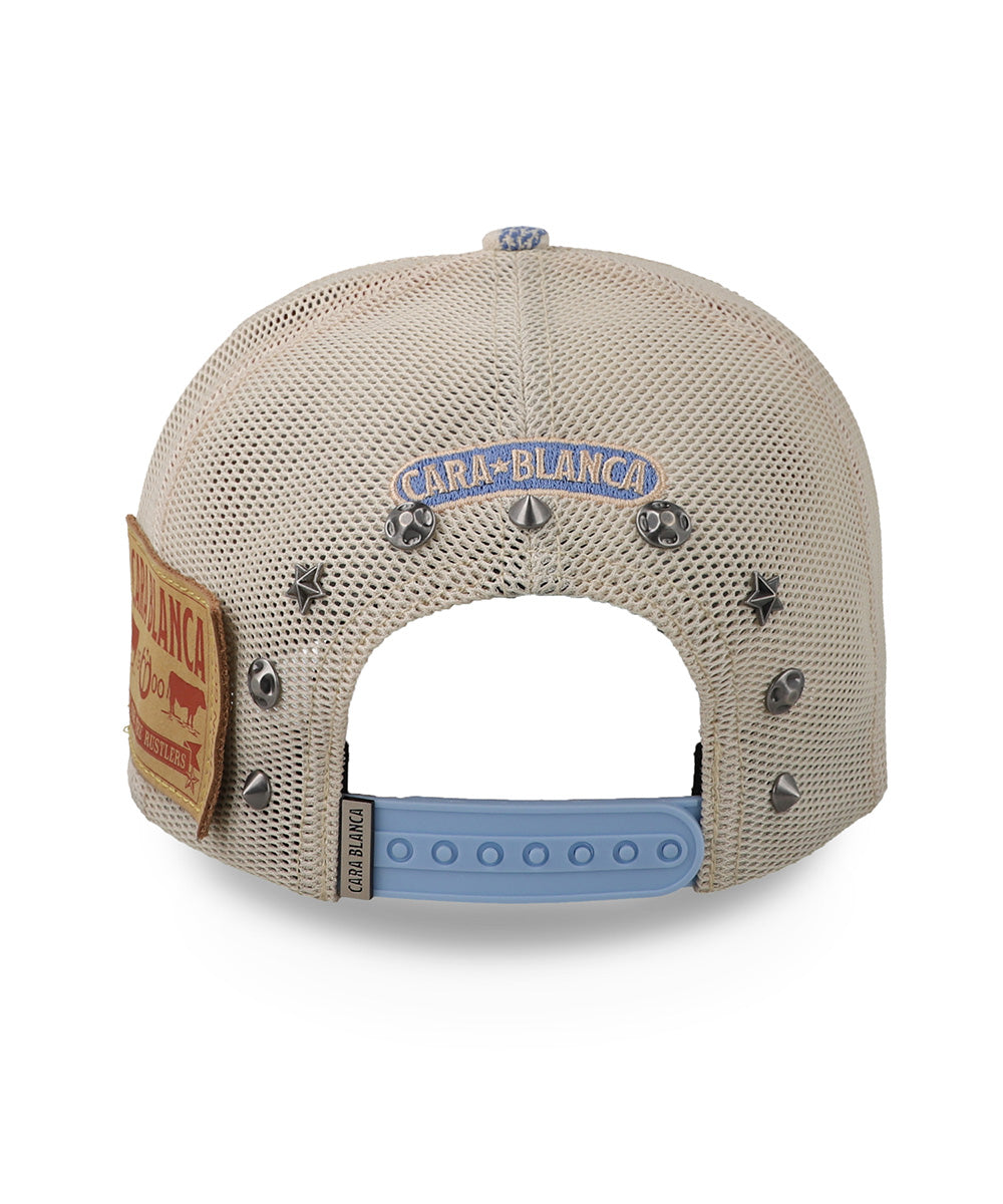 La gorra Cara Blanca Retired Cowboy destaca por su diseño western auténtico con patrón de rayas en azul y beige, parche frontal bordado y detalles metálicos que le dan un toque único. Su panel trasero de malla ofrece mayor ventilación y comodidad para usarla todo el día. Una gorra ideal para quienes viven el estilo vaquero con actitud y personalidad.